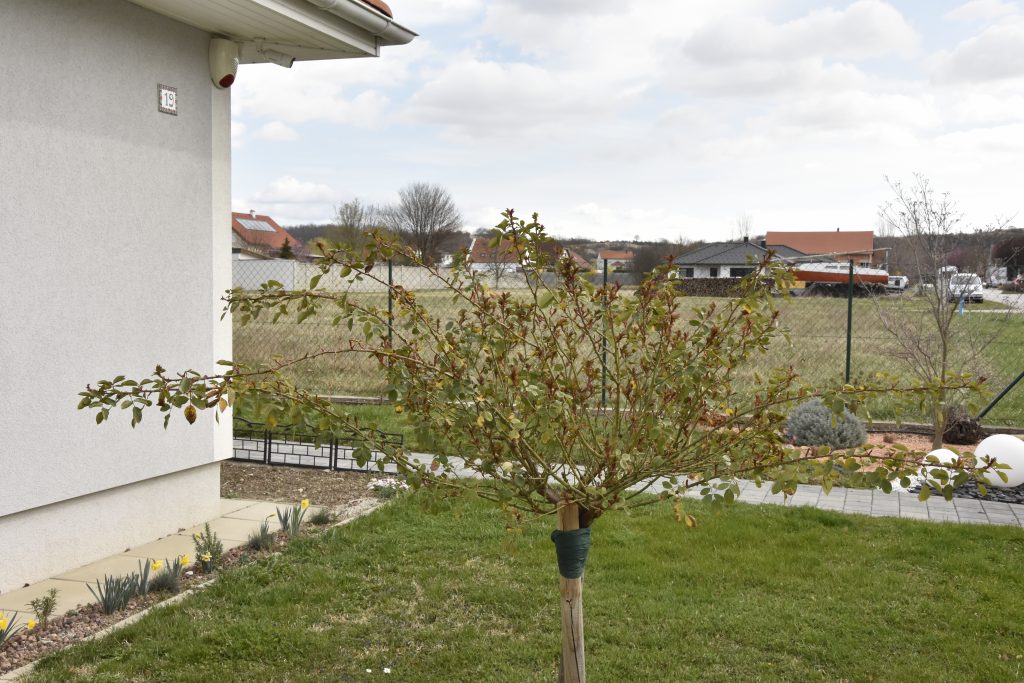 So hat der Rosenbaum überwintert. Die Veredelungsstellen wurden mit Jute-Leinen geschützt damit sie den Winter mit seinen Frosttagen gut überstehen. Anfang März begann ich mit dem Schnitt der einzelnen Zweige. Bei Hochstamm Rosen schneidet man Ende März Anfang April auf zwei bis drei Augen zurück.